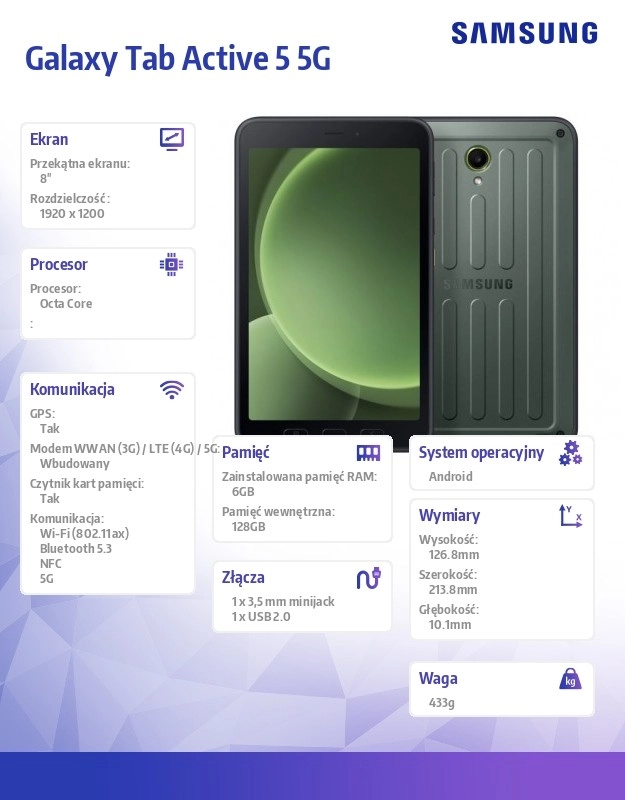 Samsung Galaxy Tab Active5 5G je robustní a odolný tablet, který je ideální pro firemní použití. S pokročilými funkcemi a výkonným hardwarem se přizpůsobí různým pracovním prostředím.