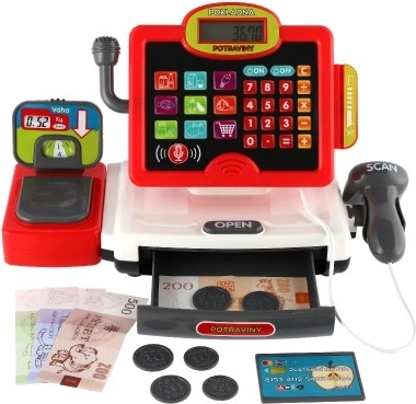 Zábavná a vzdělávací dětská elektronická pokladna s doplňky pro malé obchodníky. Obsahuje světelnou a zvukovou čtečku, makety bankovek a mincí, slot na kreditní kartu, funkční kalkulačku a váhu na ovoce a zeleninu. Ideální hračka pro rozvoj představivosti a základních počtů.
