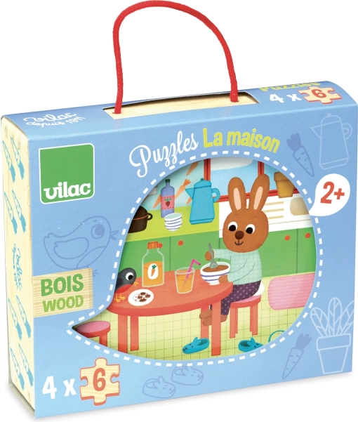 Objevte kvalitní dřevěné puzzle VILAC s motivy domácnosti, ideální pro nejmenší od 2 let. Balení obsahuje 4 samostatná puzzle po 6 dílcích v praktickém dřevěném boxu s bavlněnou rukojetí. Skvělá volba pro rozvoj jemné motoriky, logiky a soustředění dětí.