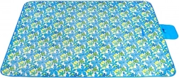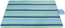Deka je dostupná ve dvou atraktivních desénech – modré květy a modro‑zelené pruhy. Spodní vrstva je voděodolná, takže je ideální do parku, na pláž i na festival. Integrované ucho pro nošení a suchý zip zaručují rychlé složení a pohodlný transport.