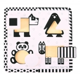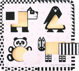 Černobílé vkládací puzzle BIGJIGS TOYS je navrženo speciálně pro nejmenší děti. Kontrastní provedení pomáhá miminkům lépe zaostřit a vnímat tvary, zatímco čtyři velkorysé dřevěné dílky s motivy zvířátek se pohodlně vkládají do příslušných otvorů.