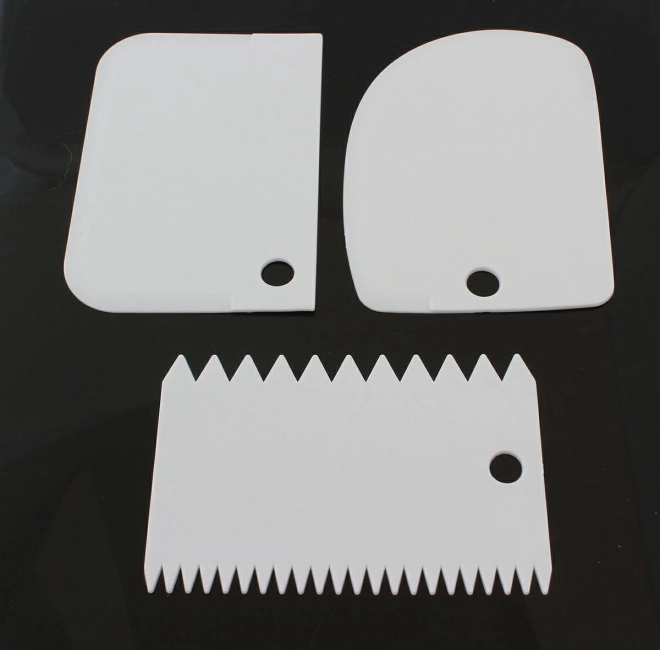 Praktická sada cukrářských karet pro snadné a přesné uhlazení a tvarování krémů i polev. Ideální pro domácí i profesionální cukráře. Získejte perfektně hladké okraje, dekorativní vzory a rychlou práci bez nepořádku.