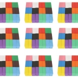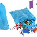 Tři síťované vaky se stahováním usnadňují přenášení a ukládání. Dřevěné kostky mají hladké hrany a jsou barveny bezpečnými barvami pro klidnou hru dětí od 3 let.