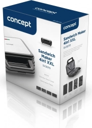Multifunkční sendvičovač 4 v 1 od značky Concept vám umožní rychle a snadno připravit chutné snídaně, svačiny a večeře. Vybaven čtyřmi výměnnými deskami XXL, ideálními pro křupavé toasty, voňavé vafle nebo grilované speciality.