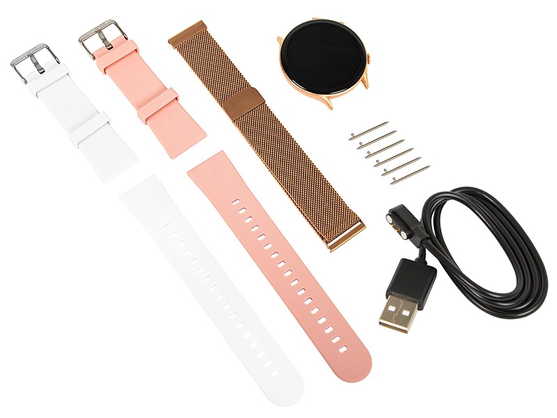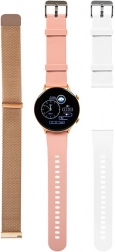 Chytré hodinky X19 růžové jsou dokonalým doplňkem pro každý den. Díky třem výměnným náramkům - zlaté, bílé a růžové - snadno přizpůsobíte svůj vzhled dle nálady. Užívejte si dotykový displej o rozlišení 360x360 px, který poskytuje ostrý a jasný obraz.