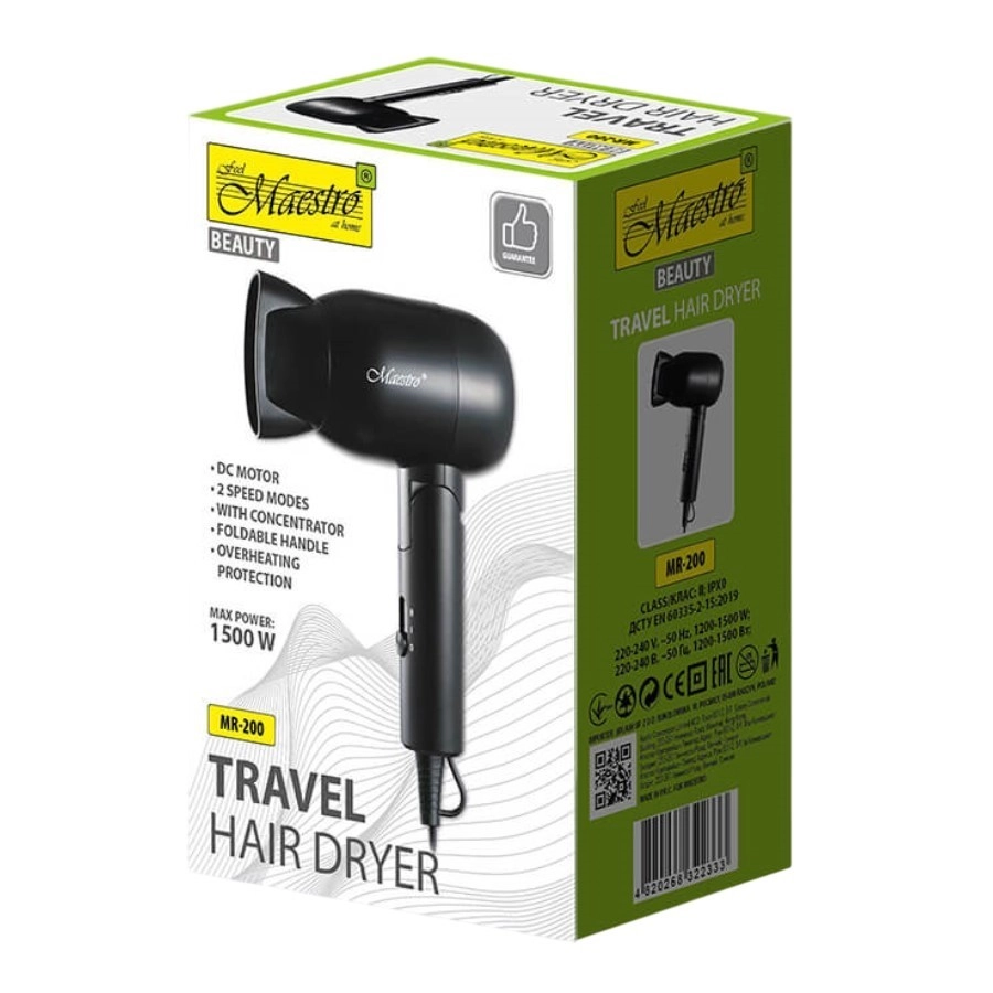 Pokud hledáte praktický, spolehlivý a kompaktní cestovní fén na vlasy, Maestro MR-200 je skvělou volbou!