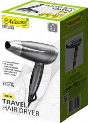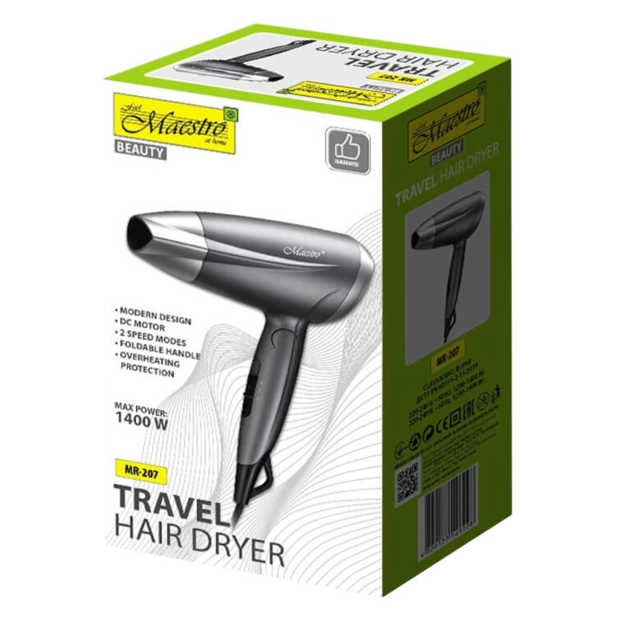 Cestovní fén Maestro je vybaven DC motorem, který zajišťuje tichý provoz a delší životnost. Součástí balení je koncentrátor pro precizní styling a skládací rukojeť pro snadné skladování a transport.