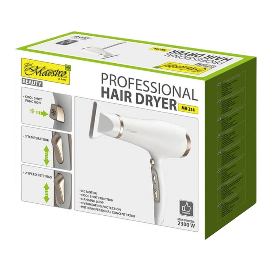 Fén je vybaven koncentrátorem pro přesné směřování proudění vzduchu, což usnadňuje precizní styling. Nabízí 2 rychlosti foukání a 3 nastavení teploty, které umožňují přizpůsobit výkon vašim individuálním potřebám a typu vlasů.