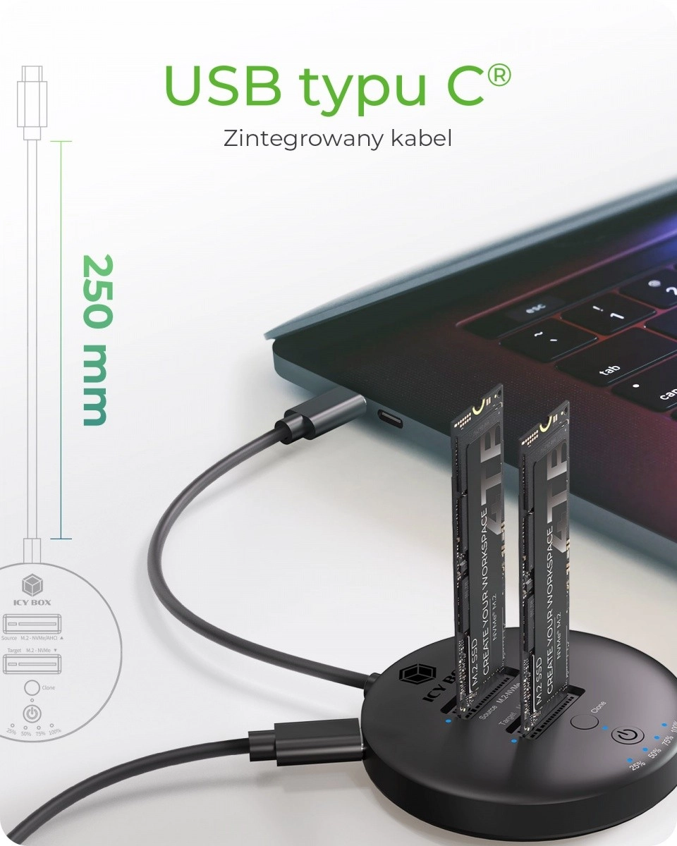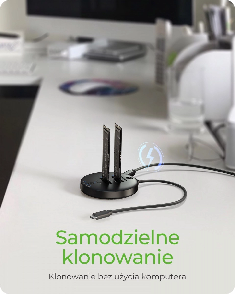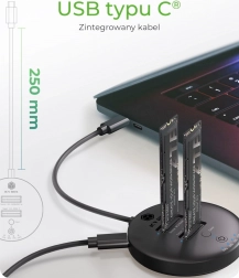 Tato stanice funguje jako dokovací stanice pro dva M.2 NVMe SSD disky, když je připojená k počítači pomocí integrovaného USB-C kabelu. Poskytuje rychlý přenos dat mezi oběma disky a podporuje vysoké rozlišení úložiště a zálohování systému v reálném čase.