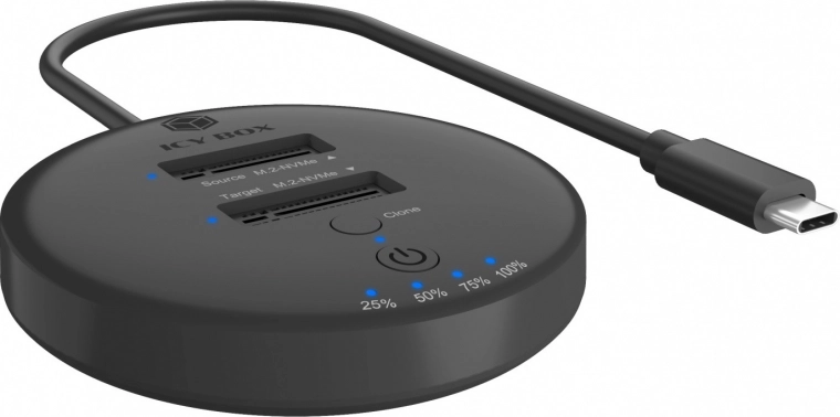 Stanice IB-1612MCL-C31 vám umožňuje samostatné klonování disků bez nutnosti připojení k počítači. Jednoduše zduplikujete celý M.2 NVMe SSD disk pro rychlou migraci systému. LED indikátory jasně zobrazují průběh klonování.