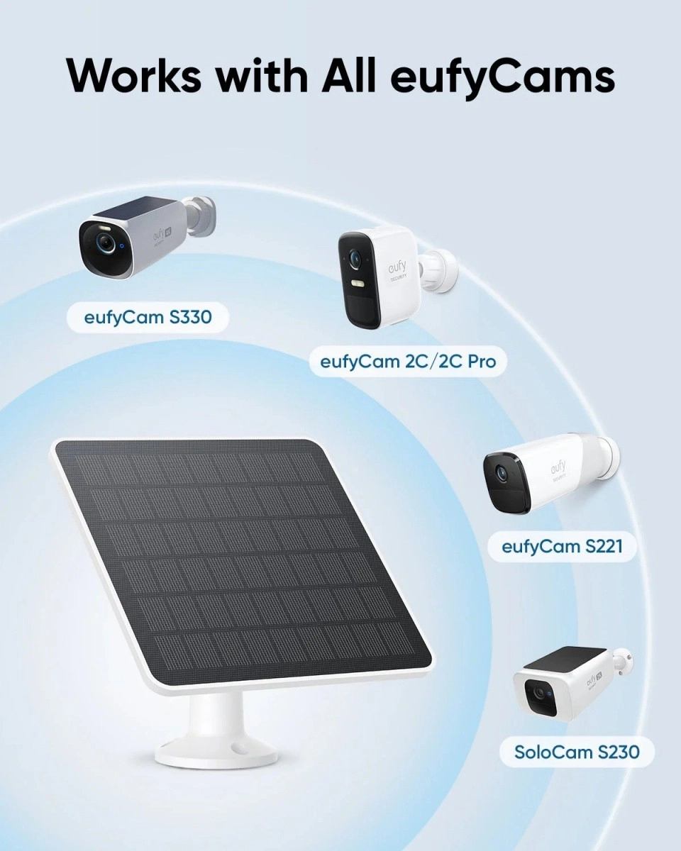 Užijte si kompatibilitu se všemi kamerami EufyCam, což znamená, že solární panel dokáže poskytnout napájení pro modely jako EufyCam 2, EufyCam 2 Pro, EufyCam 2C, EufyCam 2C Pro, EufyCam S330 a SoloCam S230.