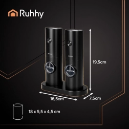 Elektrické mlýnky na pepř a sůl značky RUHHY jsou ideálním doplňkem pro všechny, kdo si potrpí na kvalitu a estetiku. Univerzální použití umožňuje jejich využití pro různé typy koření, včetně bylinek. Mletí zajišťuje keramický mechanismus, který je trvanlivý a precizní bez kovové pachuťi.