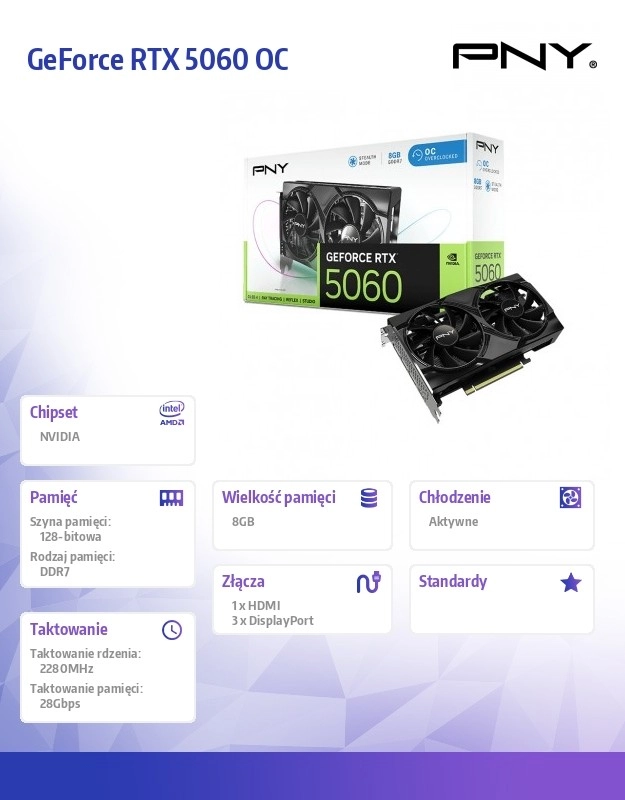 Grafická karta PNY GeForce RTX 5060 přináší hráčům a tvůrcům výjimečný grafický výkon, který posouvá hranice možností. Díky nejnovější architektuře NVIDIA Blackwell a technologie DLSS 4, můžete očekávat neuvěřitelný herní zážitek s pohlcující grafikou a vysokou obnovovací frekvencí.