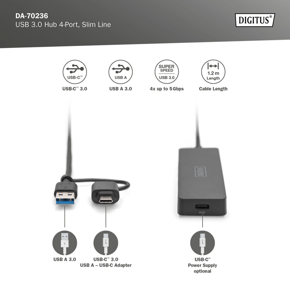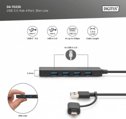Hub USB 3.0 DIGITUS Slim Line je ideálním řešením pro rozšíření konektivity na pracovišti nebo doma. Kompaktní design a 1,2metrový kabel umožňují přizpůsobit délku připojení k notebooku nebo pracovní stanici.