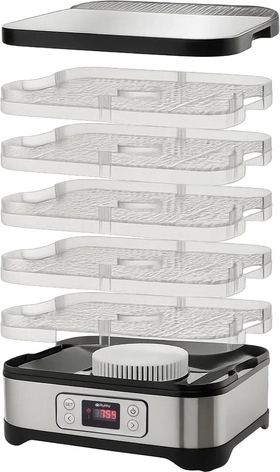 - LCD displej a ventilátor s termocirkulací pro rovnoměrné sušení na všech úrovních.