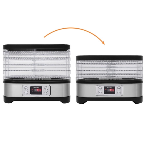 - Kapacita 10 litrů – 5 tácy poskytují dostatek prostoru pro sušení.
