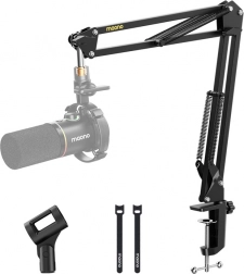 Držák na mikrofon Maono je vyroben z vysoce kvalitní oceli, což umožňuje bezpečné upevnění mikrofonů do hmotnosti až 1 kg. Jeho dvě 33 cm dlouhá ramena umožňují snadné a přesné nastavení polohy.