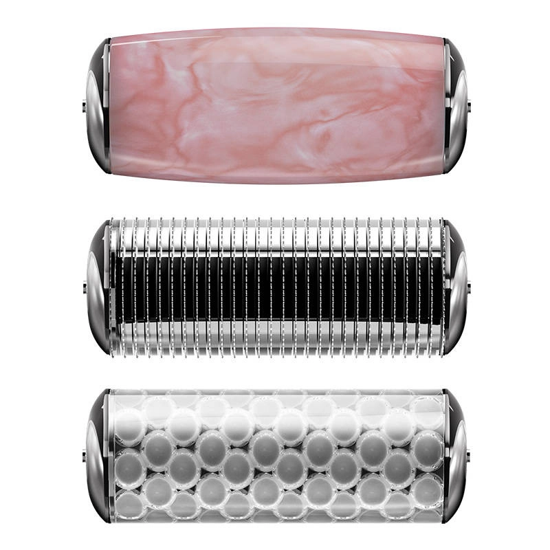 Díky myšlenému designu je váleček bezpečný a efektivní. Je vyroben z dermatologicky testovaného silikonu a umožňuje snadné magnetické nabíjení. Tři vyměnitelné hlavy - jehlová, křemenná a chladicí - přinášejí různé možnosti péče o pleť.