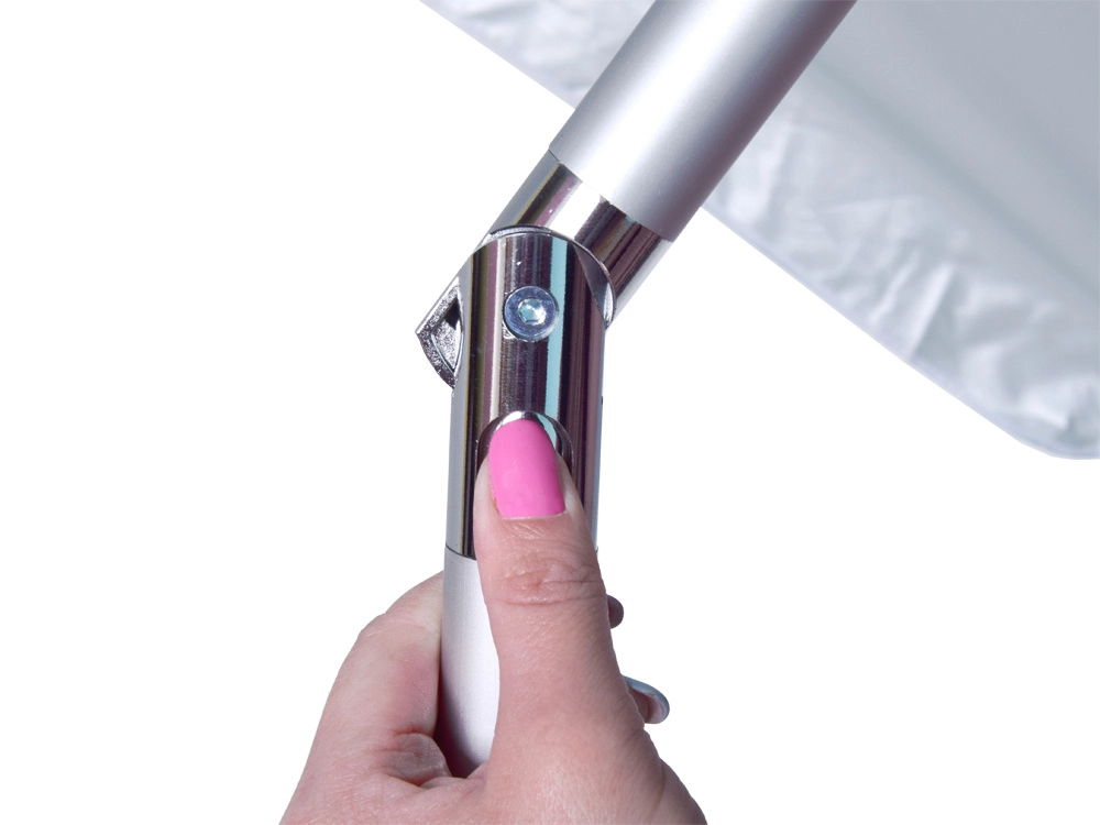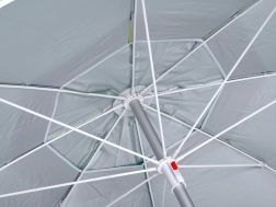 Pevný kovový sloupek, 8‑dílný výplet a větrací otvor pro lepší proudění vzduchu. Lámací kloub umožní přesné nastavení stínu během dne.