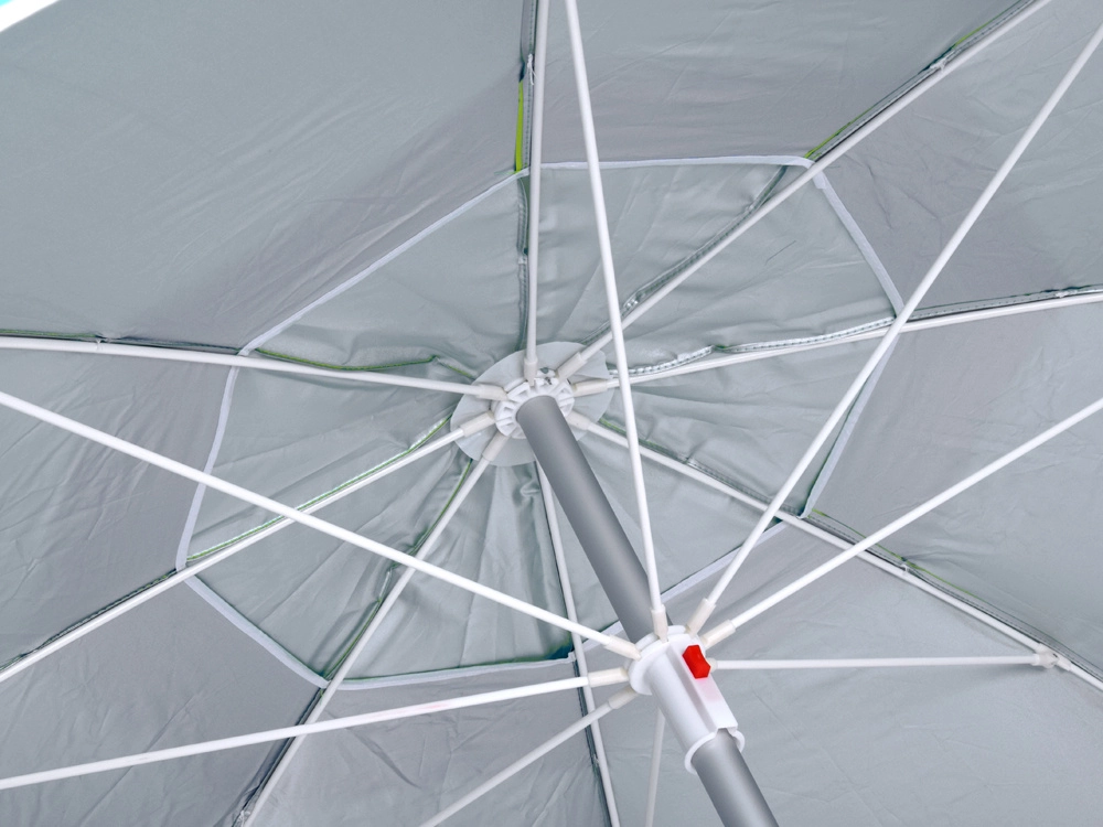 Promyšlená konstrukce se zpevněným 8‑dílným výpletem, větracím otvorem a lámacím kloubem umožňuje rychlé nastavení úhlu vůči slunci a lepší stabilitu ve větru. Montáž je otázkou vteřin – pomůže písečná/zemní kotva, aretační šroub i praktický uvolňovací systém pod střechou.