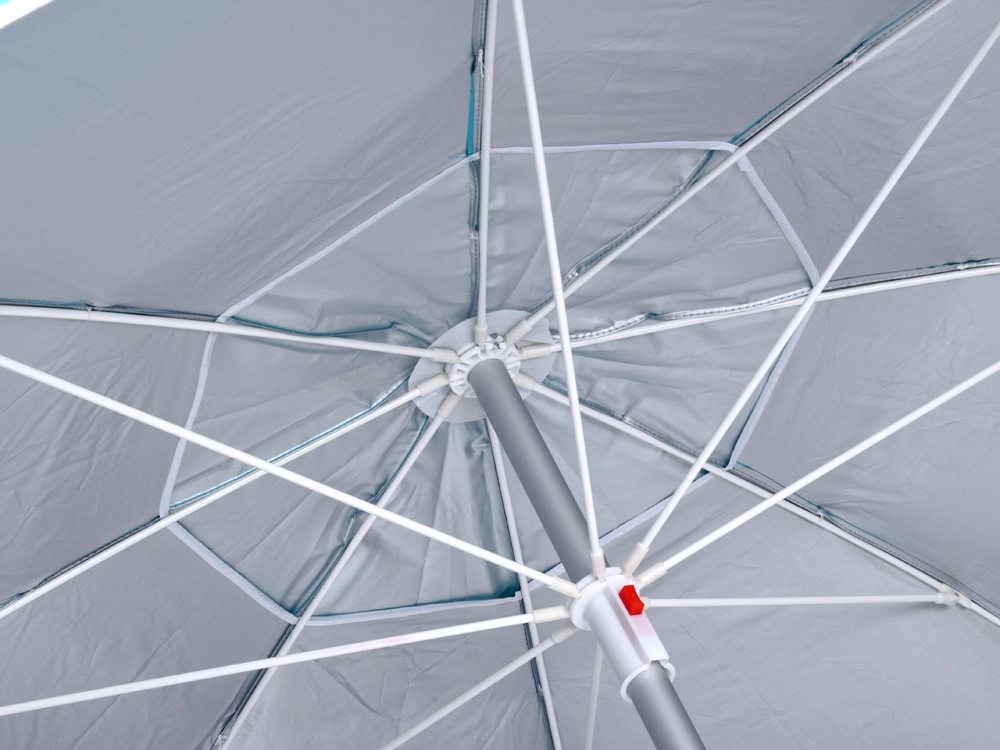 Odvětrávaná 8-dílná střecha, kvalitní rám a zemní kotva drží slunečník stabilně v písku i v půdě.