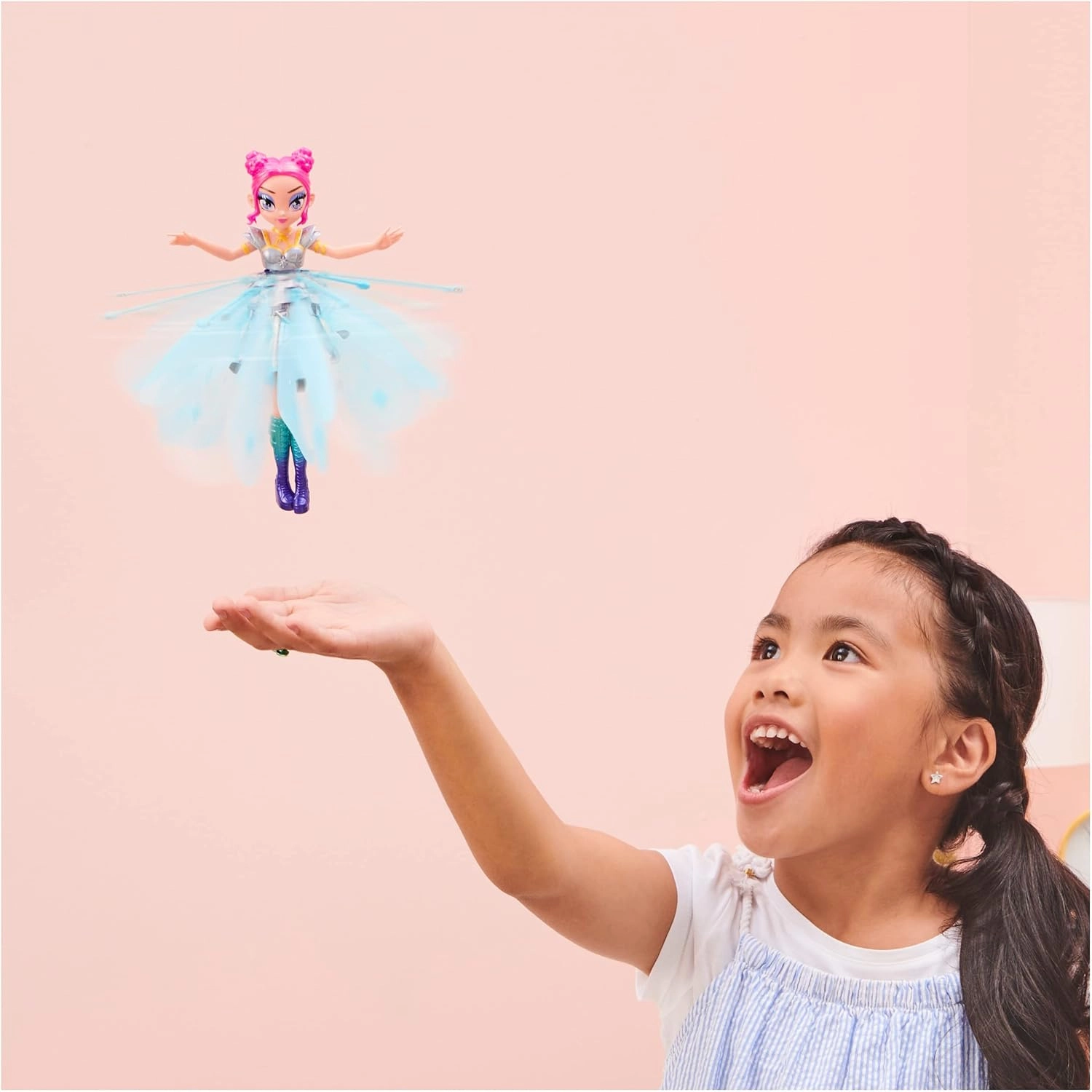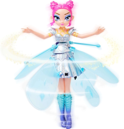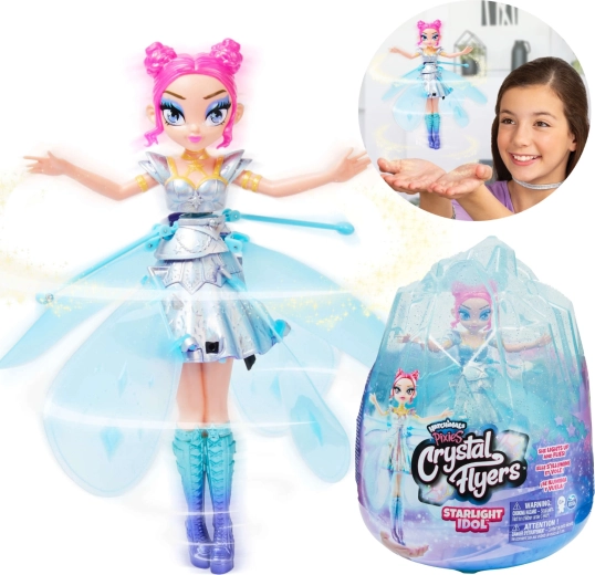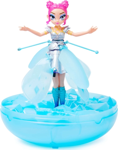 Létající víla Hatchimals Pixies se ukrývá v třpytivém krystalovém pouzdře, které slouží jako elegantní základna i úložný kryt. Po spuštění víla pomocí rotujících křídel vzlétne a citlivě reaguje na polohu vašich rukou – když je máte níže, klesá, když výše, stoupá. Jednoduchým dotykem křidélek let bezpečně ukončíte.