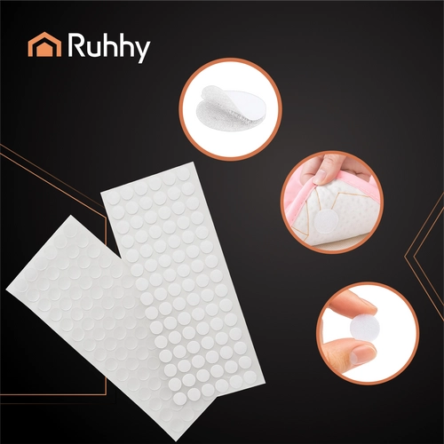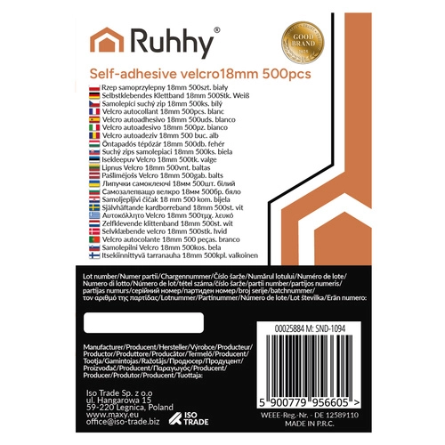 Suchý zip Ruhhy zahrnuje dvě části: háček a smyčku, které umožňují pevné a opakované spojení. Díky samolepící vrstvě je montáž rychlá a vhodná na různé povrchy od plastu až po sklo.