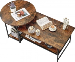Možnost zasunutí kulatého stolu umožňuje rychlé přizpůsobení prostoru aktuálním potřebám – lze jej využívat jako samostatný stolek nebo část setu. Oba stolky mají další police pro ukládání novin, knih, dálkových ovladačů nebo dekorací. Tento set se skvěle hodí do loftových, industriálních, ale také moderních a klasických aranžmá.