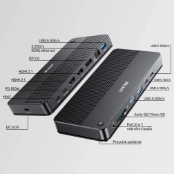 Vychutnejte si jednoduchost a výkonnost, kterou nabízí dokovací stanice Unitek, umožňující simultánní připojení všech nezbytných periferií. Sloty pro SD a Micro SD karty, tři video porty (2x HDMI a 1x DisplayPort), trojice USB-A a dvojice USB-C portů, Ethernet RJ-45 s přenosovou rychlostí až 2,5 Gbps – to vše v jednom elegantním zařízení.
