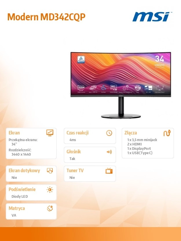 Modern MD342CQP přináší produktivitu i zábavu na novou úroveň. Díky rozlišení UWQHD na 34" úhlopříčce máte více prostoru pro aplikace, časové osy i postranní panely. Zakřivení displeje vás vtáhne do děje a zlepší periferní vnímání, ať už upravujete fotky, stříháte video, nebo se ponoříte do her.