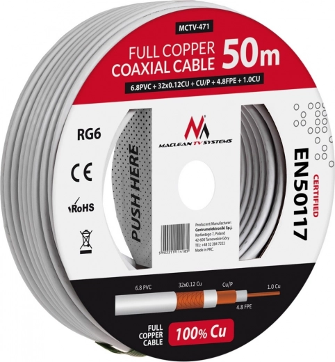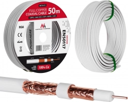 Vysoce kvalitní koaxiální kabel RG6 z plné mědi o délce 50 metrů zajišťuje skvělý přenos signálu bez rušení, a to i u dlouhých instalací.