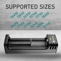 - Rychlé nabíjení: typické akumulátory 18650 2200 mAh dobijete za pouhých 2,5 hodiny