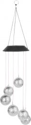Tato lampa se skládá ze šesti prolamovaných koulí zavěšených na tenkých laněch, které jemně září a odrážejí světlo vestavěných LED diod RGB. Díky solárnímu napájení není třeba žádných kabelů nebo baterií – jde o ekologické a pohodlné řešení. Vestavěný soumrakový senzor automaticky zapíná světlo, jakmile padne tma.