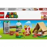 Vytvořte si dobrodružnou scénu s táborem kapitána Toada: postavte stan s bednou na poklady, rozdělejte ohníček, prozkoumejte skalní plošinu a aktivujte padací most, který pošle protivníka do „lávy“. Hledejte a schovejte diamanty, porazte Goombu a odpočívejte u ohně – zkrátka dokonalá porce kreativního hraní.