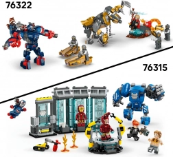 Zažijte epickou bitvu dobra a zla s ikonickými hrdiny z univerza MARVEL. Set přináší realistickou akci: zelený Hammerův dron s pružinovým vystřelovačem, modrý dron s dvojitými vystřelovači, minifigurku IRON MAN s modrými blastery a minifigurku WAR MACHINE s červenými blastery a ramenním miotáčem kostiček.