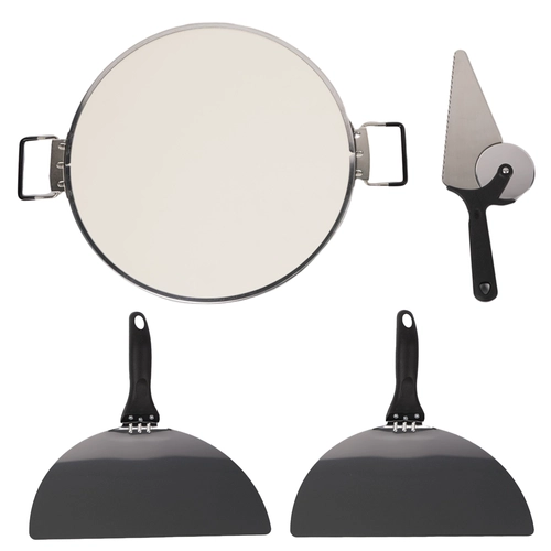 - Ceramic pizza stone with handles, 2 shovels, 2-in-1 knife, user manual, styrofoam protection, colored packaging, brown transport carton