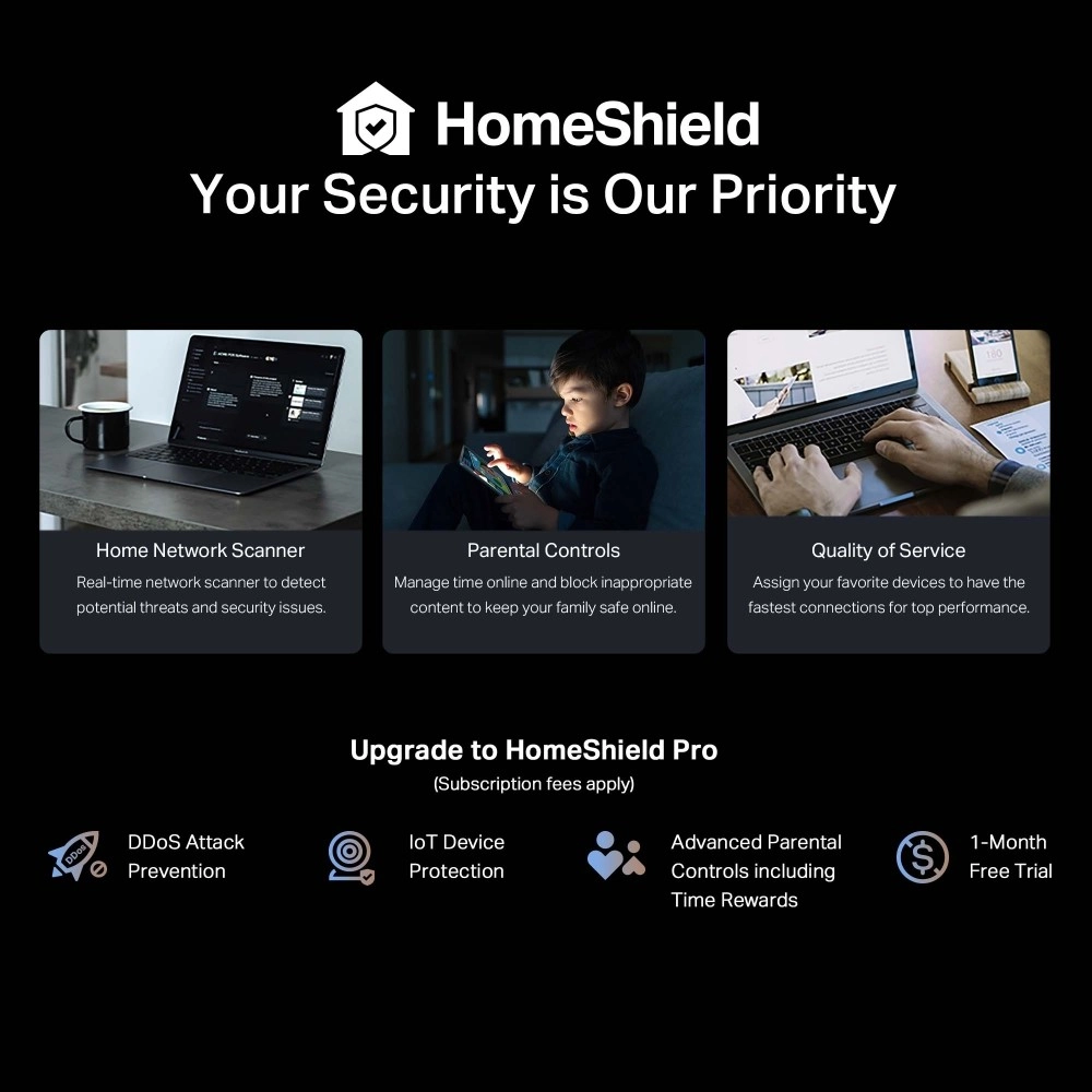 Vysoce pokročilé bezpečnostní funkce TP-Link HomeShield chrání vaši domácí síť před kybernetickými hrozbami.