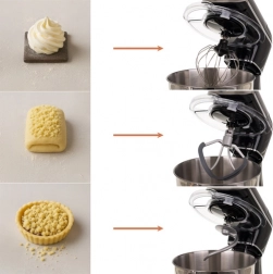 V balení najdete bohaté příslušenství: hák na těsto, metlu, ploché míchadlo, kryt mísy, špachtli, separátor žloutků i kompletní cukrářskou sadu s 24 trezírovacími špičkami v organizéru. Nechybí ani QR kód s recepty, které vás provedou krok za krokem. Protiskluzové nožky zajišťují stabilitu a vybrané díly lze mýt v myčce.