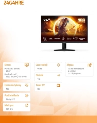 AOC 24G4HRE je 23,8" herní monitor, který kombinuje 200 Hz obnovovací frekvenci, Fast IPS technologii a 1 ms GtG / 0,5 ms MPRT pro perfektně plynulý obraz v rychlých scénách. HDR10 dodává živé barvy a hlubší kontrast, zatímco Adaptive Sync a G‑SYNC kompatibilita eliminují trhání a zadrhávání.