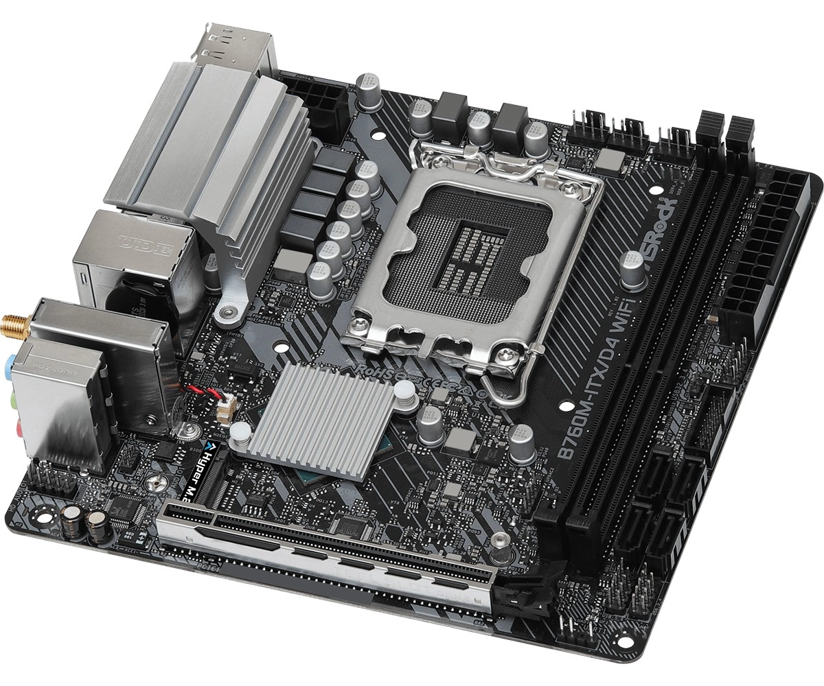 ASRock B760M-ITX/D4 WiFi je výkonná mini‑ITX deska pro stavbu kompaktních PC. Podporuje moderní procesory Intel Core (LGA1700), rychlé paměti DDR4 až 5333+ (OC), grafické karty přes PCIe 4.0 x16 a rychlá úložiště díky Hyper M.2 (PCIe Gen4 x4). Stabilní napájení zajišťuje 5+1+1 VRM s Dr.MOS, zesílené 6vrstvé PCB a ocelový PCIe slot.