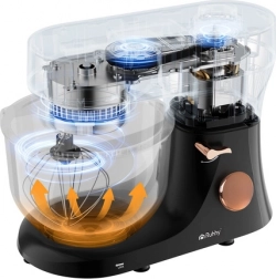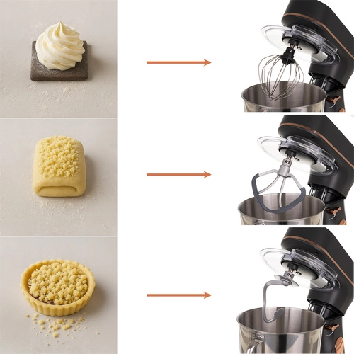 - Bohaté příslušenství: hák na těsto, metla, šlehací balón, víko, stěrka, separátor vajec, cukrářský rukáv s 24 nástavci v organizéru.