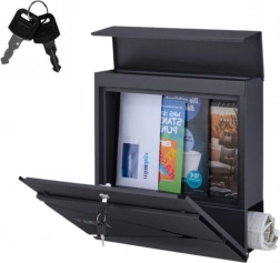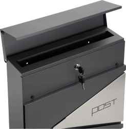 Stylová poštovní schránka v antracitové barvě kombinuje moderní vzhled a praktické detaily. Je vyrobena z kvalitní pozinkované oceli s práškovým lakem, takže je odolná proti korozi, počasí i mechanickému poškození. Pojme formát A4, má široký vhoz 3,5 cm a samostatný držák na noviny dole. Bezpečné uzavření zajišťuje zámek se dvěma klíči.