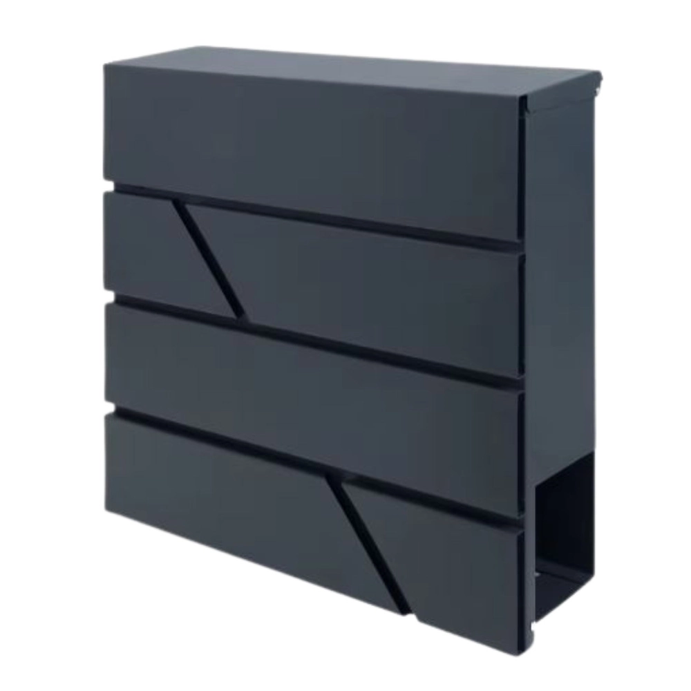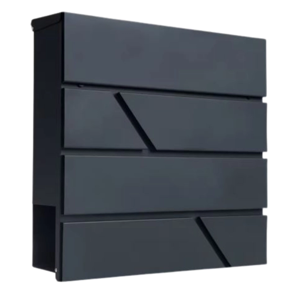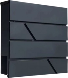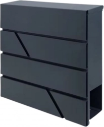 Tato velká poštovní schránka kombinuje funkčnost a nadčasový vzhled. Je vyrobena z pozinkované oceli lakované práškovou barvou, což zajišťuje vysokou odolnost proti korozi, dešti a mechanickému opotřebení. Geometrické výřezy dodávají moderní charakter a snadno ladí s různými styly fasád.