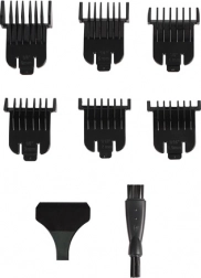 V balení nechybí 6 vodicích hřebenů (1–9 mm), USB‑C kabel, ochrana břitu a čisticí kartáček pro jednoduchou údržbu. Strojek lze používat bezdrátově i během nabíjení, takže je vždy připravený k práci doma i v barber shopu.