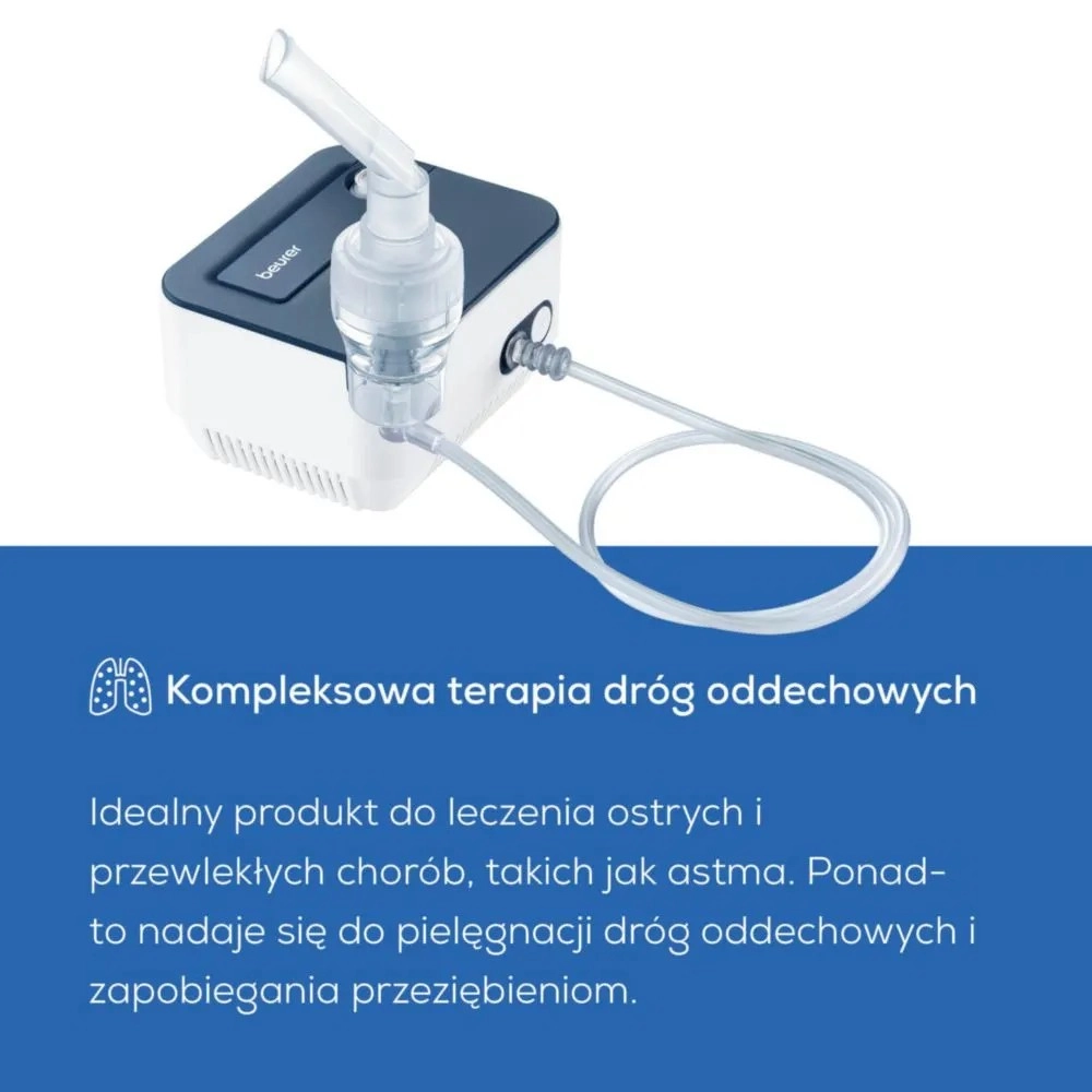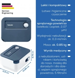 Kompaktní a výkonný inhalátor BEURER IH 16 je zdravotnický prostředek určený pro terapii horních i dolních dýchacích cest při nachlazení, astmatu a onemocněních dýchacích cest. Nabízí vysoký podíl respirabilních částic pro cílené ošetření, rychlou nebulizaci díky technologii stlačeného vzduchu a snadné ovládání jedním tlačítkem. Díky snadnému čištění a příslušenství včetně dětské masky je vhodný pro celou rodinu.