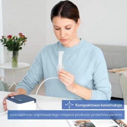 Zařízení je navrženo pro hygienické a pohodlné použití – má odnímatelné části pro jednoduché čištění a je kompatibilní se všemi léčivy určenými a schválenými k inhalaci (vždy se řiďte doporučením lékaře nebo lékárníka). Technologie stlačeného vzduchu (kompresorová) zajišťuje efektivní rozprašování a kratší čas inhalace díky vysokému výkonu nebulizace.
