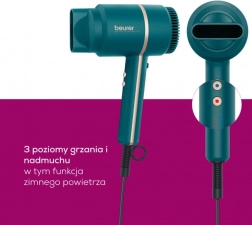Ovládání je intuitivní – k dispozici máte 3 stupně teploty a rychlosti, přehlednou LED kontrolku režimu a tlačítko studeného vzduchu pro fixaci účesu. Odnímatelný bezpečnostní filtr usnadňuje čištění a prodlužuje životnost přístroje, zatímco automatické vypnutí při přehřátí zajišťuje bezpečný provoz.