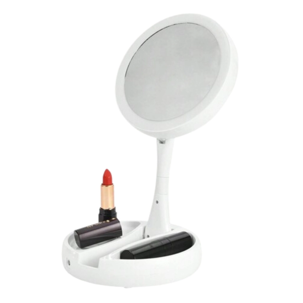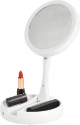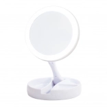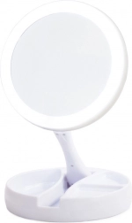Elegantní stolní zrcátko s LED podsvícením a dvoustrannou plochou (1× a 10× zvětšení) je ideální pro make‑up, péči o pleť i nasazování čoček. Díky otočné konstrukci 180° snadno přepnete stranu, zatímco praktický organizér v základně udrží kosmetiku po ruce. Napájení zajistí 4× AA baterie nebo kabel MicroUSB pro maximální pohodlí.