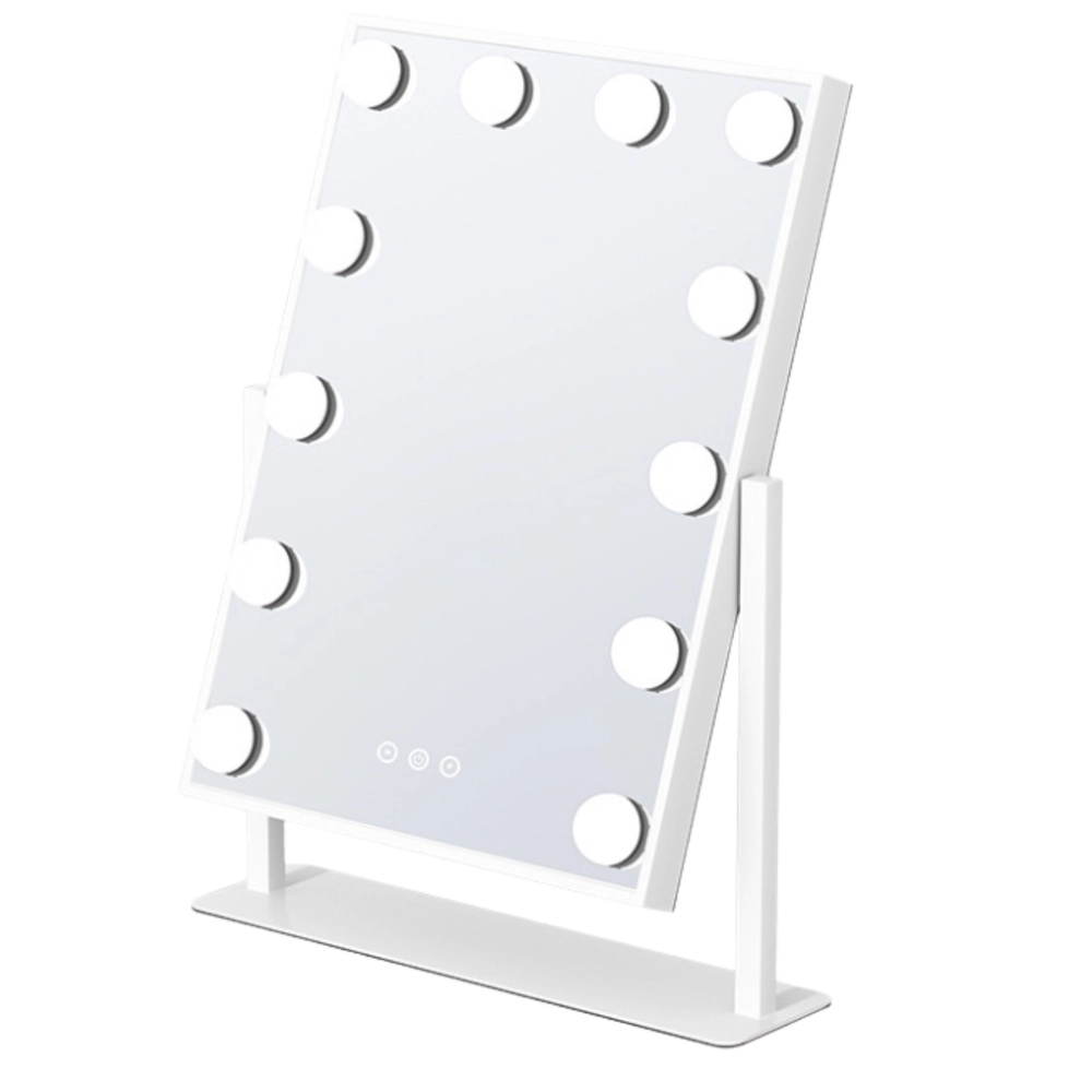 Elegantní hollywoodské zrcadlo s 12 LED žárovkami poskytuje rovnoměrné a jasné světlo pro perfektní líčení i účesy. Dotykový panel umožňuje 3 barvy světla (teplá, neutrální, studená bílá) a plynulé stmívání s funkcí paměti. Stabilní kovová konstrukce a otočný rám 360° zajistí ideální úhel. Stylový doplněk pro toaletku, koupelnu i salon.