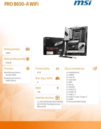 MSI PRO B650-A WIFI je kompaktní mATX základní deska navržená pro moderní platformu AMD AM5. Díky podpoře procesorů Ryzen 7000/8000/9000 a pamětí DDR5 až 7600+ MHz (OC) poskytuje vysoký výkon, rychlou odezvu a stabilitu pro náročné aplikace, multitasking i herní sestavy.